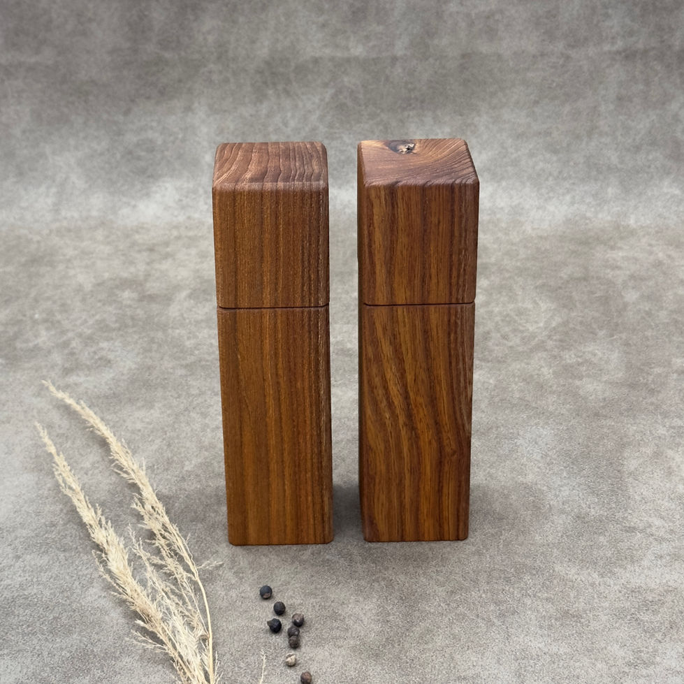 Das Holz stammt vom Abschnitten eines Ulmenbaumes (auch Rüster genannt). Bei einer der Mühlen wird die Einzigartigkeit durch einen kleinen Asteinschluss am Kopfteil hervorgehoben. Die Oberfläche wurde gebürstet, was dem Mühlenset eine sehr angenehme Handhabung verleiht.